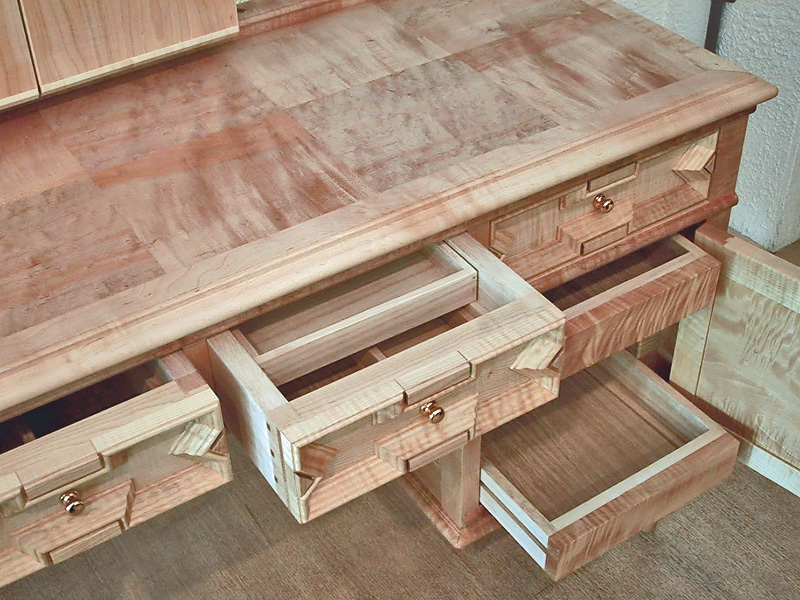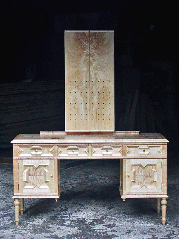 テーブル本体はイタヤカエデ総無垢、天板は組み木造り。鏡扉に特徴のあるトチ板を使用しています。